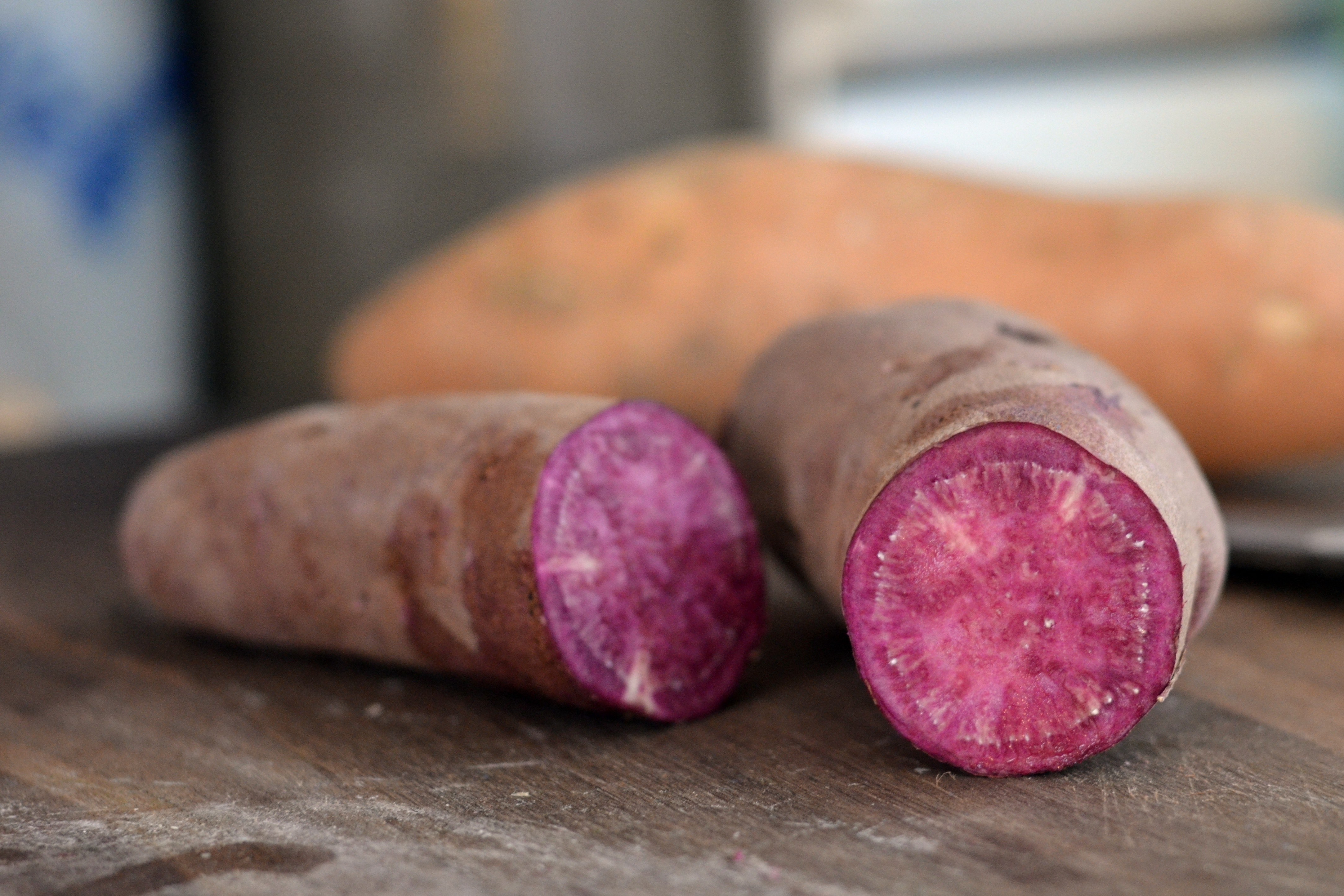 I love feeding our son new foods and am delighted when he enjoys all of the new sights, smells, and and tastes of our varied palate. I can’t wait to have him help me select veggies and fruits that are every color of the rainbow and can help me prepare them for our meals. Purple vegetables are one of my favorite food color groups. They are stunning on a table but pack a serious nutritional punch as well. Down to Earth writes about the virtues of Okinawan (purple) sweet potatoes on their website.