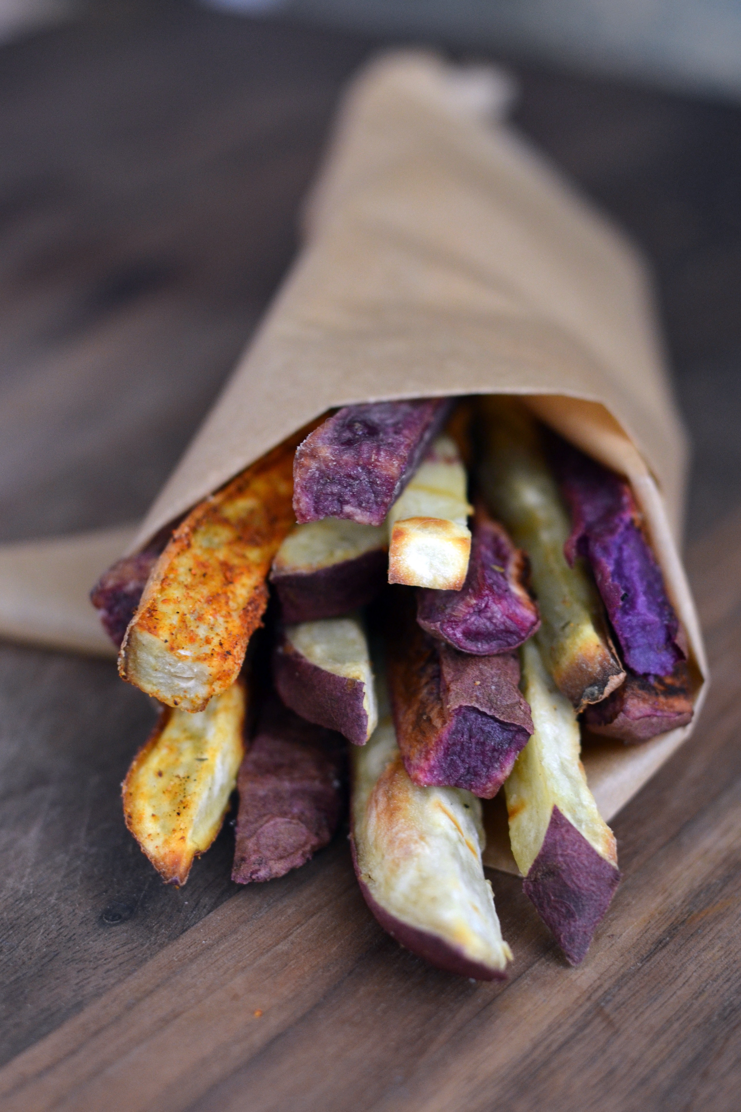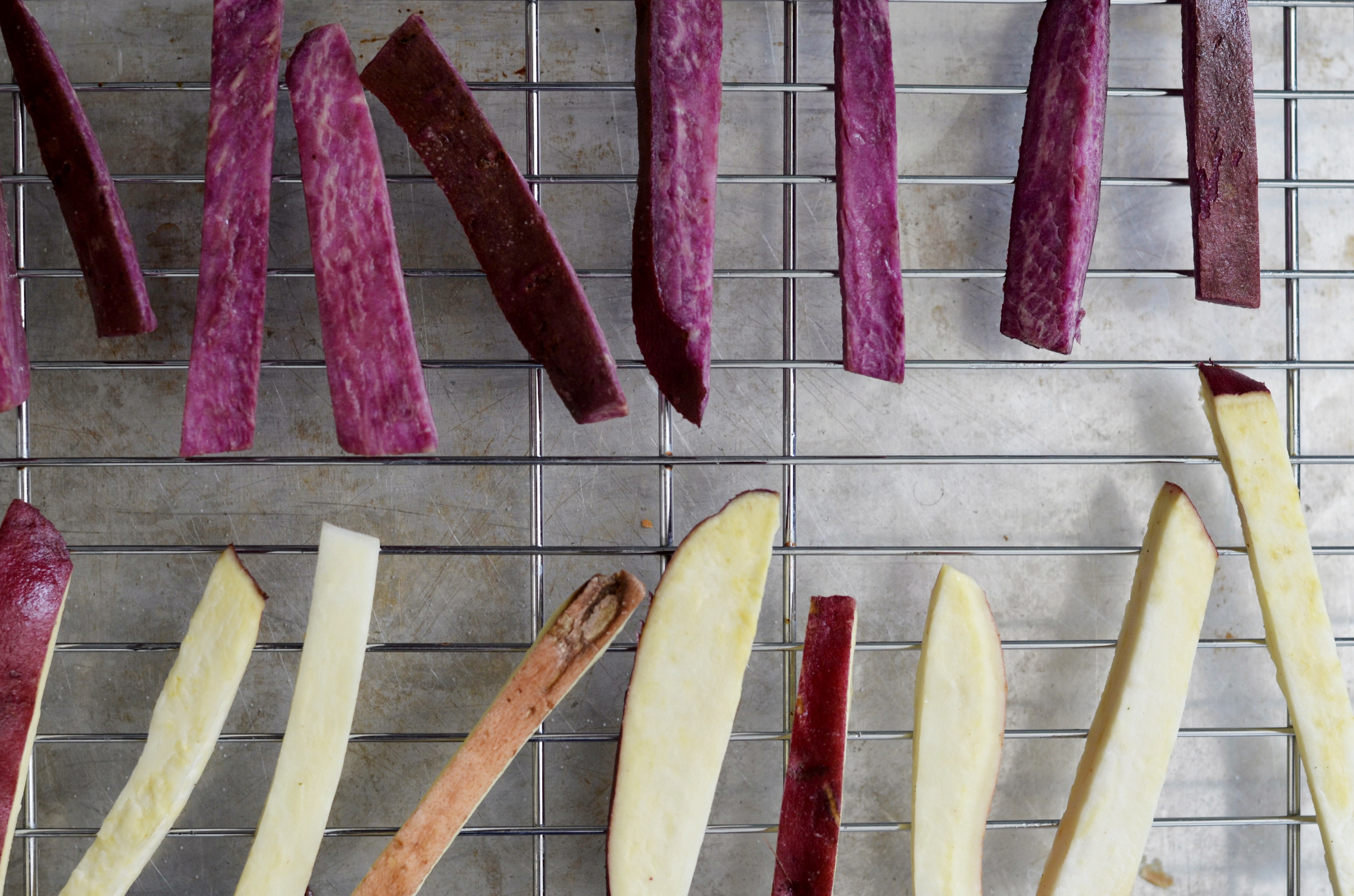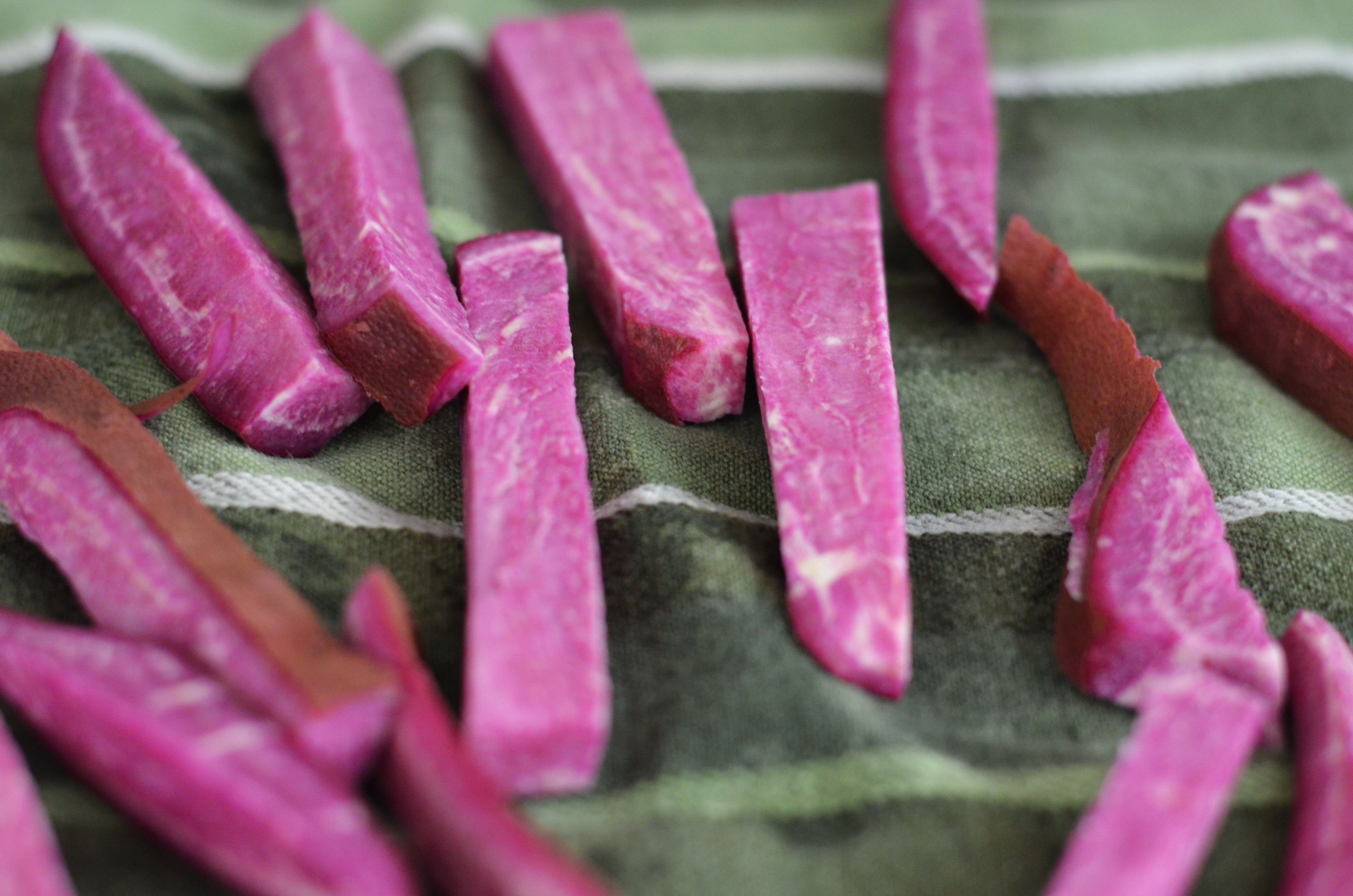 My husband makes our 16 month old son sweet potato fries regularly for an afternoon snack and he gobbles them up faster than you can say hot potato. So when I was at the health food store the other day and saw Okinawan purple sweet potatoes and Japanese white sweet potatoes, I had to get them for an extra special, healthy, and colorful treat.