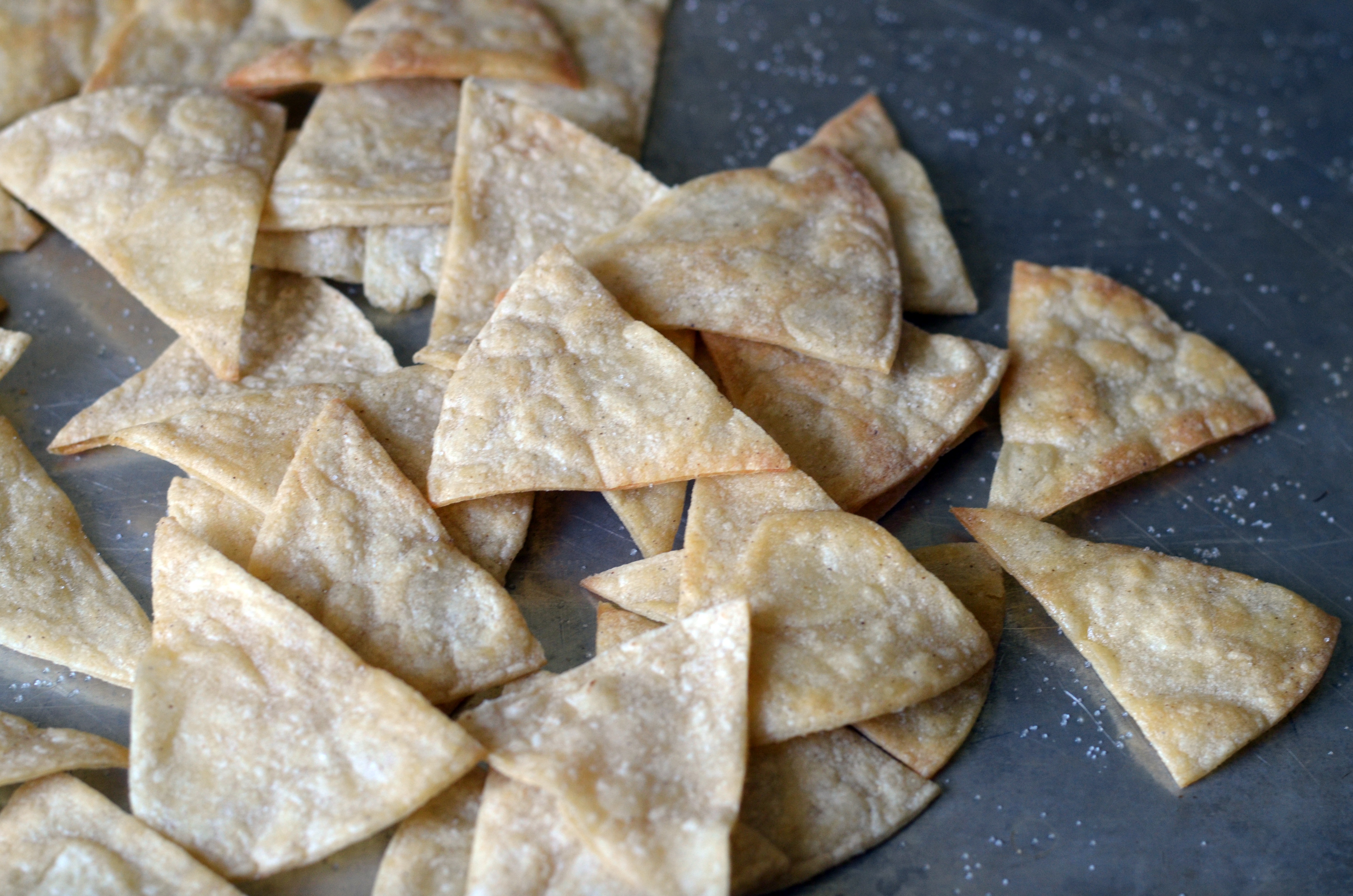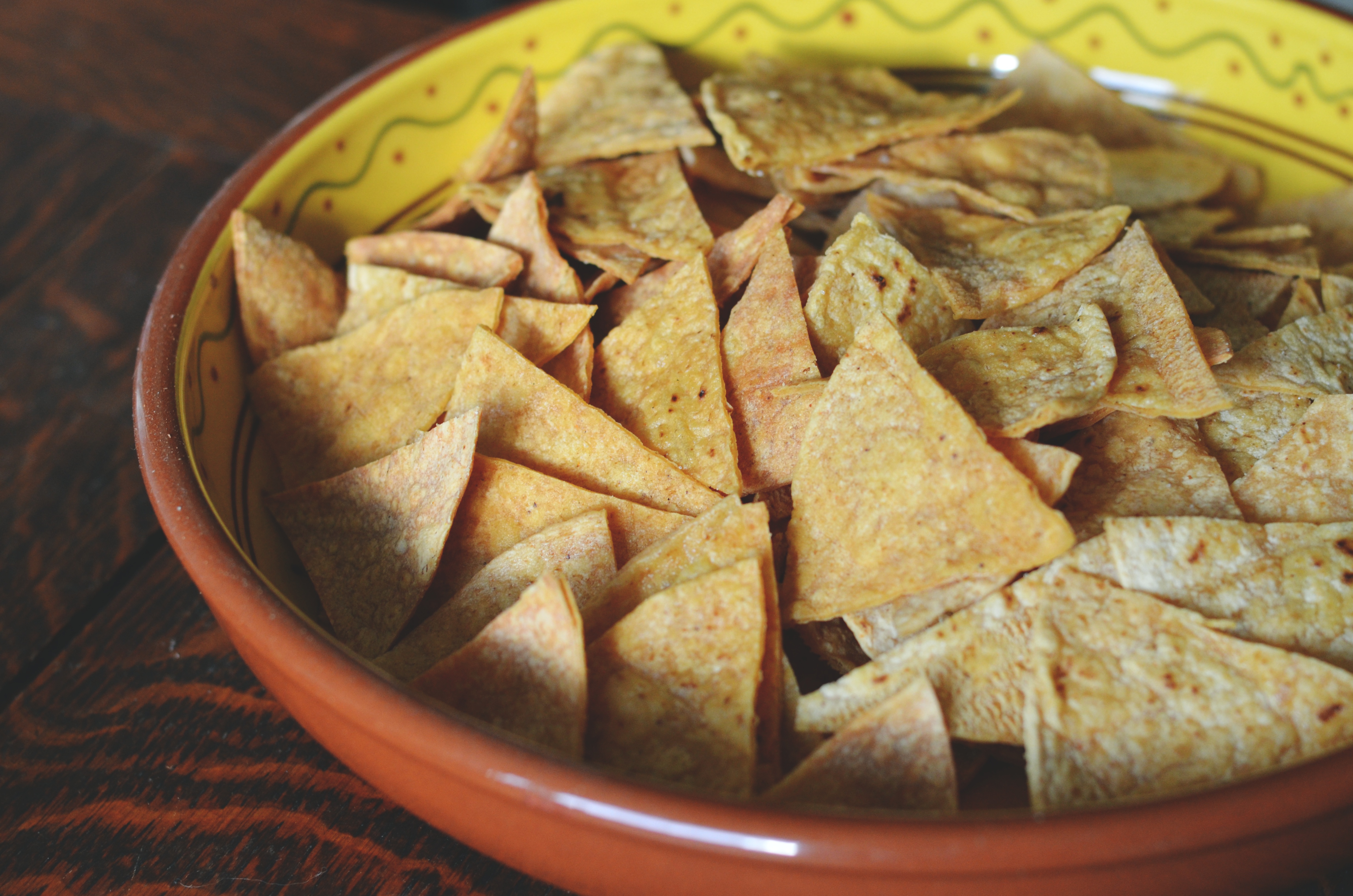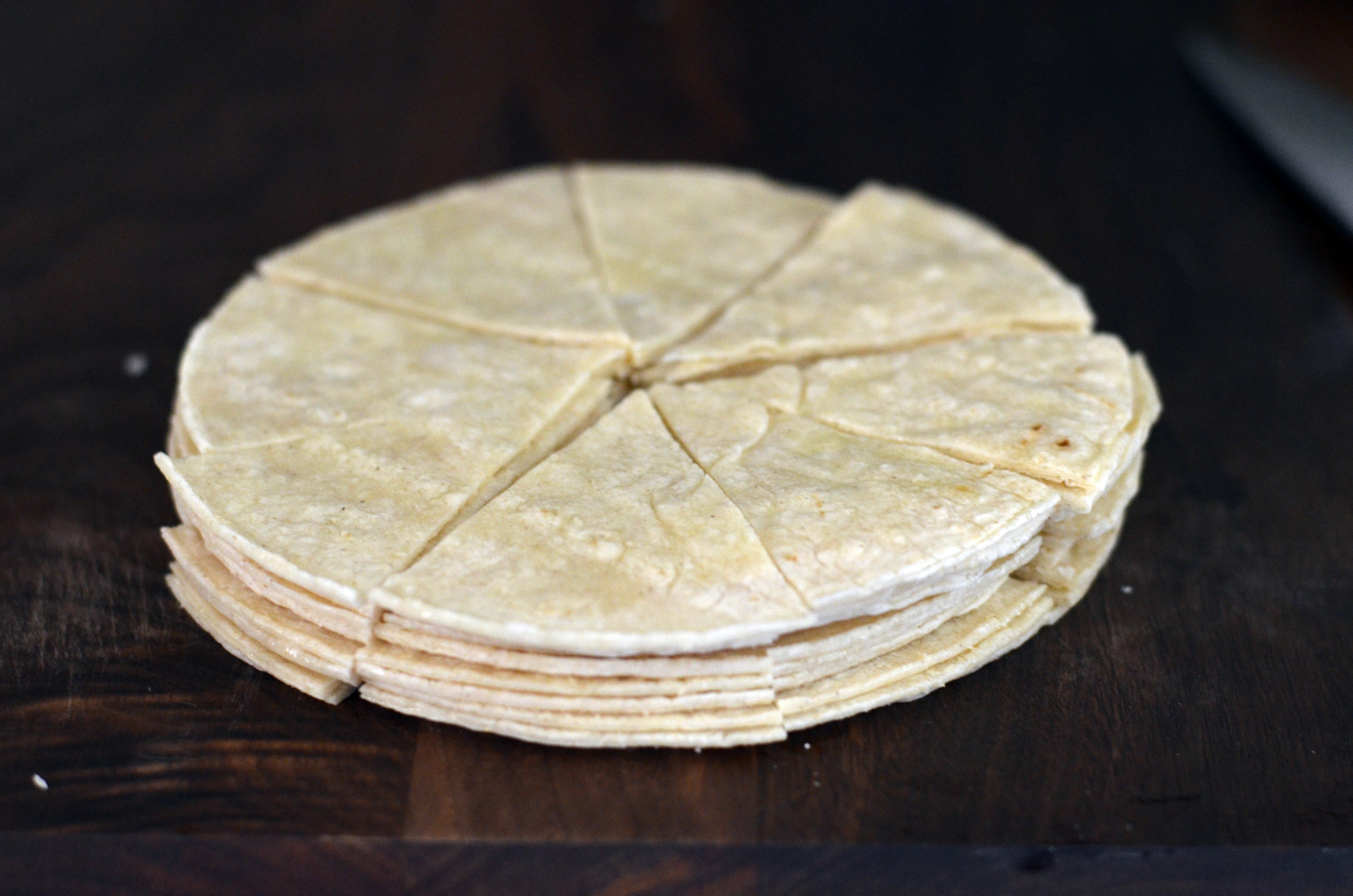 - Tortilla Chips: Preheat oven to 400 degrees. Using a pastry brush, brush one side of each corn tortilla with a light layer of olive oil. Stack one on top of the other with oil side up - the un-oiled side will become oiled from the tortilla it is set upon. Cut the stacked tortillas into 8 wedges. Place tortilla pieces on a single layer on a baking sheet. Sprinkle with salt. Bake 10 to 12 minutes until lightly browned.