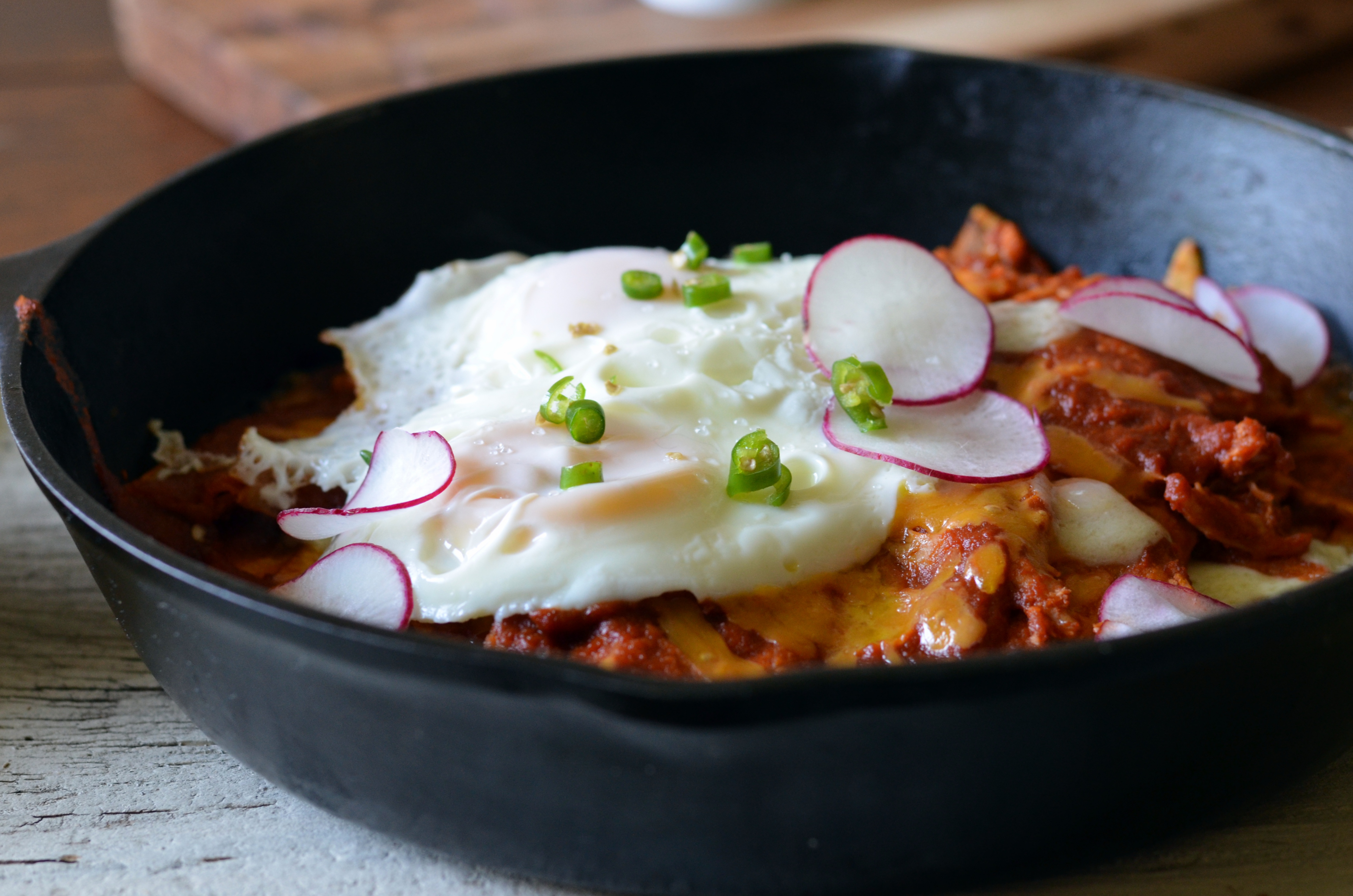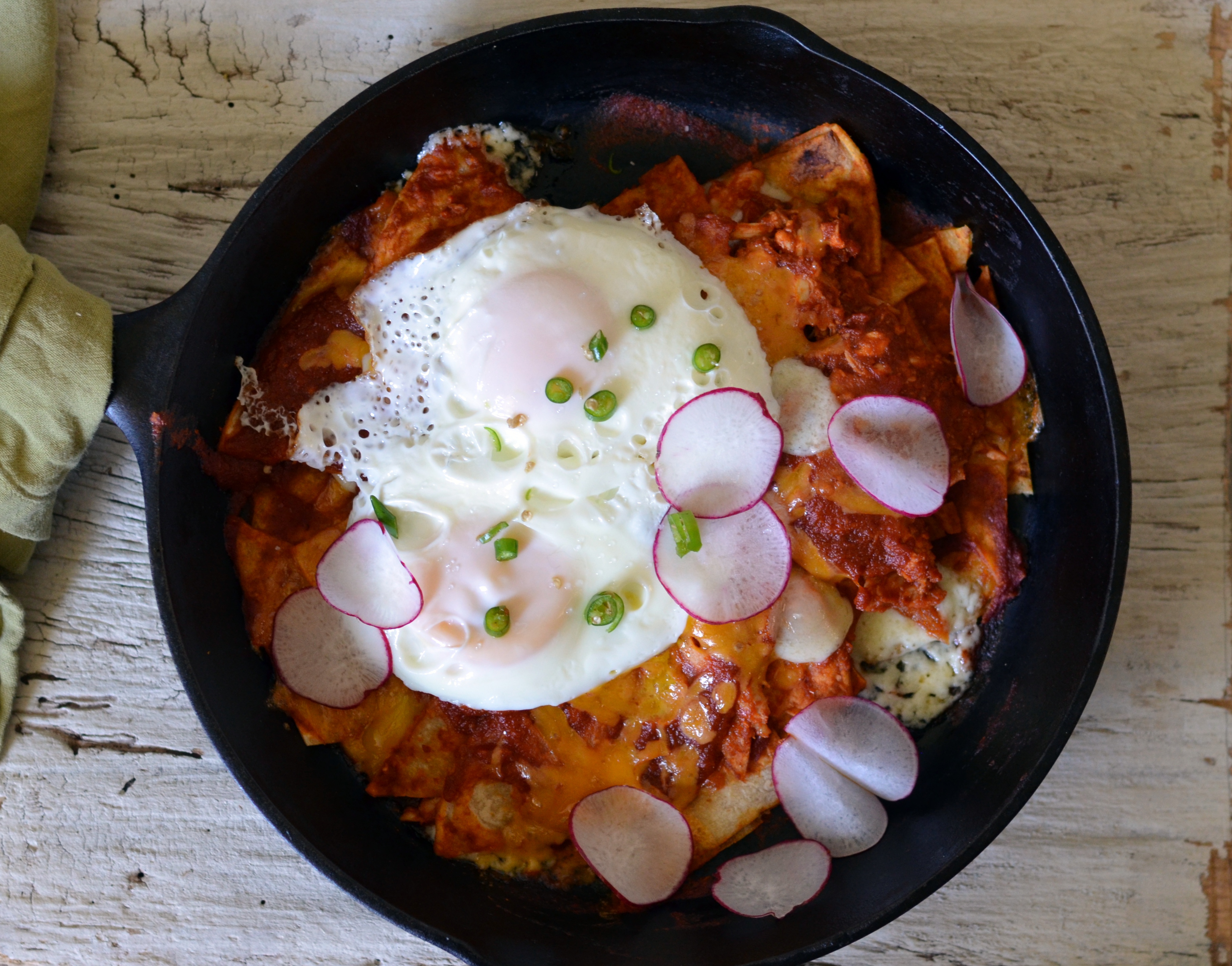- Top chilaquiles with chopped onion, radishes, cilantro, and lime wedges. Top with fried eggs and serve with remaining sauce alongside.
