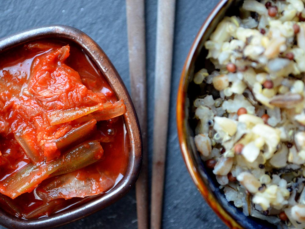 can i just tell you how incredibly impressed i am with this?! amazing. i do quick pickling too, nothing fancy, to have on hand to eat with dinner (an asian/family tradition that i forgot when i left home but am now bringing back into my diet…) and i shied away from making kimchi because of the smell (how is the smell, btw?) and how long it takes to come together… i am also loving your special grain blend, very interesting!